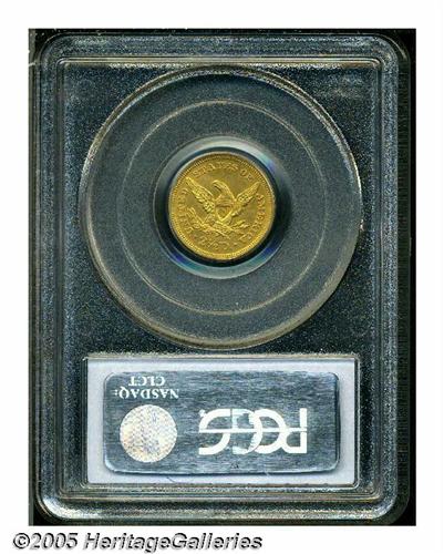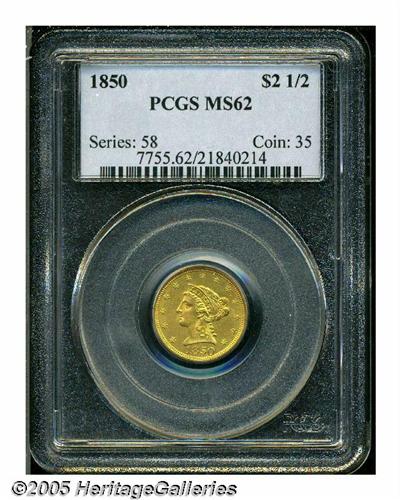 <B>1850<$2 1/2> MS62 PCGS.</B></I> The 1850 is decidedly uncommon in MS60 and above. The population figures below show that it is particularly scarce in MS62 (the grade of the current specimen) and higher levels of preservation. Pleasing apricot-gold surfaces display soft luster and sharply struck devices. Some wispy handling marks are noted over each side, especially on the obverse. Population: 15 in 62, 12 finer (3/05).