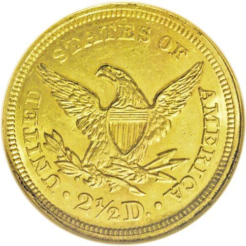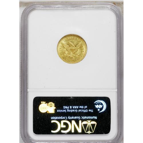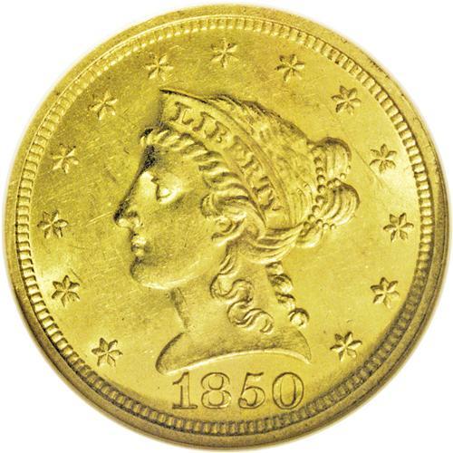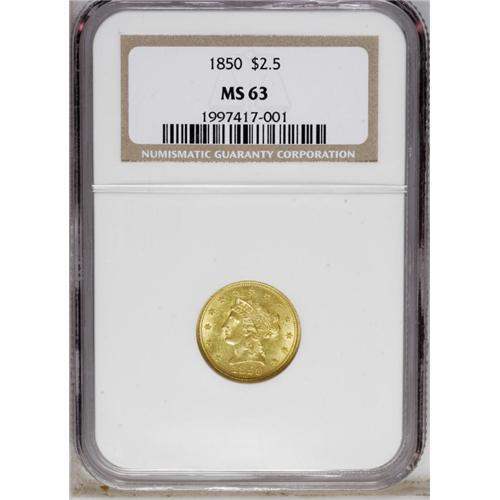 <B>1850<$2 1/2> MS63 NGC.</B></I> This issue's original mintage of 252,923 pieces is sizeable for a quarter eagle from this era. As such, the 1850 is widely regarded as an early Liberty type coin, an assessment which is only really accurate for circulated survivors. In Mint State, the '50-P is one of numerous unsung condition rarities in this long-lived series. This important Select representative has rich green-gold highlights. More deeply set yellow-gold colors are also evident, and the eye appeal benefits even further from an above-average strike that includes emerging definition, save for that on the eagle's left (facing) leg. Neither side possesses many outwardly distracting abrasions, but a shallow graze at the juncture of Liberty's neck and jaw is noted for pedigree purposes. Census: 13 in 63, 8 finer (7/06).