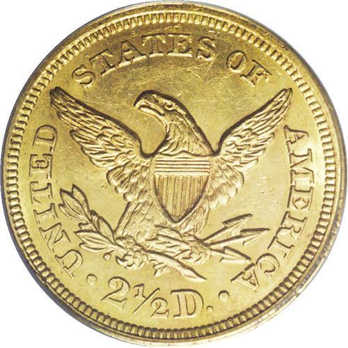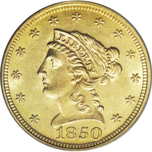 <B>1850 $2 1/2 MS63 PCGS.</B></I> The 1850 is readily available in circulated and lower Mint State grades, but becomes more difficult in the mid and higher Uncirculated levels of preservation. The current MS63 example displays a yellow-gold cast and nice luster for the grade. Some field-motif contrast is apparent when the coin is tilted beneath a light source, and wispy handling marks in the fields and on Liberty's cheek define the grade. Population: 16 in 63, 4 finer (10/06).<BR><BR><b>Shipping:</b> Coin/Currency (<a target="_blank" href="http://www.heritageauctions.com/common/shipping.php">view shipping information</a>)