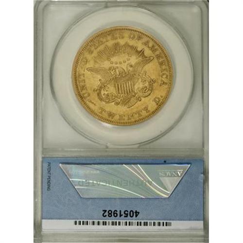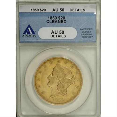 <B>1850 $20 --Cleaned--ANACS. AU50 Details.</B></I> This date is extremely popular as the first regular issue for the double eagle denomination. The piece shows some hairlines, and has a slightly bright appearance from improper cleaning, but is still an attractive example overall. <BR><BR><B>Coin Engraver:</B> James B. Longacre<BR><BR><b>Shipping:</b> Coins & Currency (<a target="_blank" href="http://www.heritageauctions.com/common/shipping.php">view shipping information</a>)