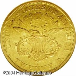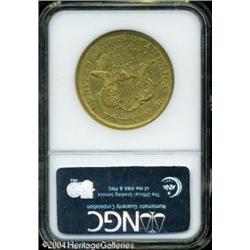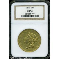1850 $20 AU50 NGC. An original coin with light gre <B>1850 $20 AU50 NGC.</B></I> An original coin with light green-gold color in the fields and a number of visible surface marks. Some luster remains in the protected areas. Popular first year of issue. <BR><BR><B>Important notice:</B> Heritage usually auctions material at the rate of 200-250 lots per hour. On some occasions eBay Live bid software or the Internet may not be able to keep up with the pace of the auction. We recommend placing a realistic absentee bid now as insurance to avoid disappointment. Occasionally the auctioneer may eliminate or reject an eBay Live bid, and the auctioneer may also reopen a lot after the close of the eBay live bidding (usually because we missed an audience bid), and may reject your bid even if it shows you as the winning bidder. By bidding via eBay Live, you agree that Heritage may award the lot to another bidder at its sole discretion under the circumstances described above or any other reasonable circumstances. Since eBay bids are not shown to us until we open the lot on the floor, we treat those bids just like floor bids. In most cases the floor responds before the eBay bid is presented to us, due to Internet lag time, so for consistency we have made it a policy that floor bids are always considered first over tie eBay live bids. Also please note that all Heritage lots purchased through eBay Live carry a 20% Buyer's Premium. Please make sure you read the Terms and Conditions before you bid. This lot is being auctioned in conjunction with a live floor auction by Heritage Galleries & Auctioneers. All final auction and invoice information will be supplied by Heritage Galleries & Auctioneers, and all other information should be considered preliminary. Lot:6829