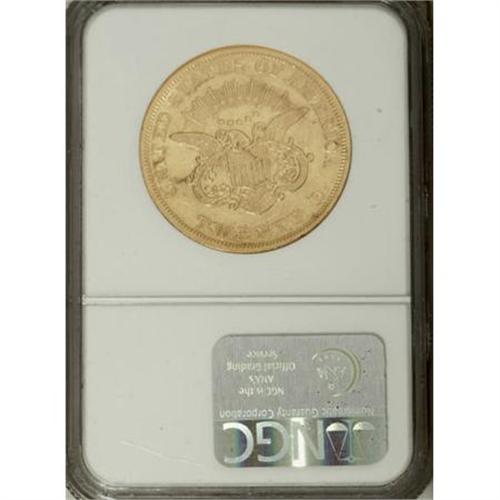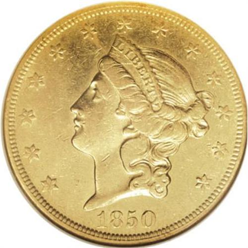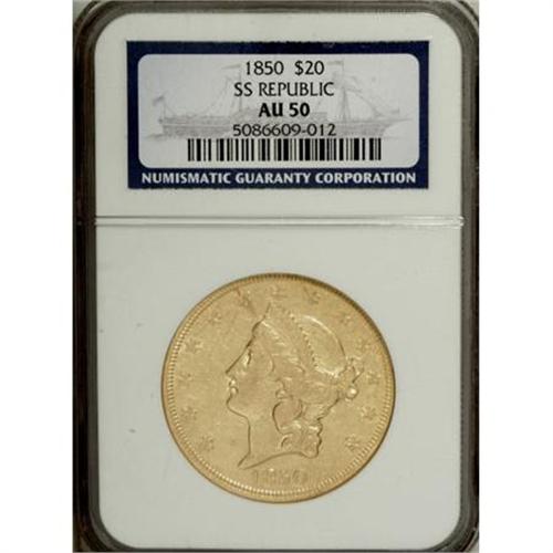<B>1850 $20 AU50 NGC.</B></I> <I>Ex: S.S. Republic.</B></I> This straw-gold double eagle retains glimpses of its initial luster, and the subdued surfaces are only lightly abraded, accounting for light circulation. Minutely granular near obverse star 6. Most of the twenties from the SSCA were struck at San Francisco; the present piece is an exception.<BR><BR><B>Coin Engraver:</B> James B. Longacre<BR><BR><b>Shipping:</b> Coins & Currency (<a target="_blank" href="http://www.heritageauctions.com/common/shipping.php">view shipping information</a>)