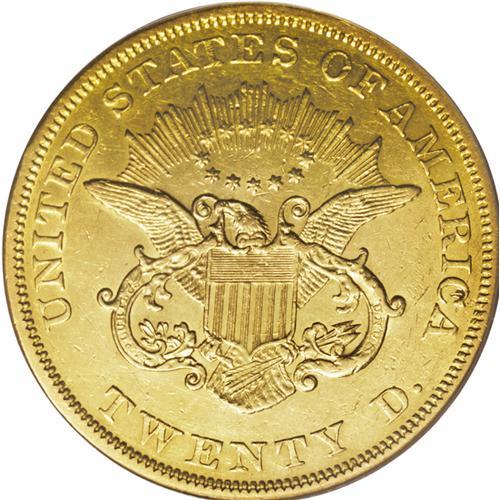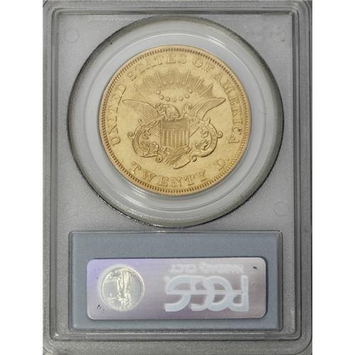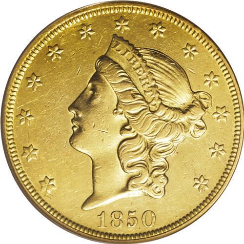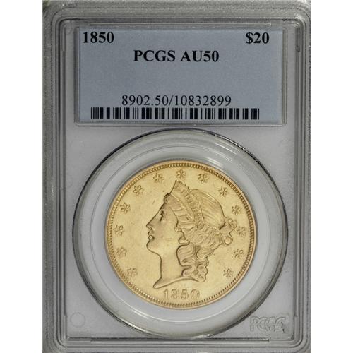 <B>1850 $20 AU50 PCGS.</B></I> 1850 saw the introduction of the double eagle series, a denomination that would continue until the cessation of circulating gold coinage in 1933. As the first of its type, the 1850 double eagle is a popular piece, yet tough to find in Mint State, which leads collectors to high grade circulated pieces such as the present bright gold coin. Noticeable wear is evident on the highest points of the design, particularly on Liberty's hair, yet a good deal of luster is readily visible in the recessed areas. The surfaces are marked appropriately for a large coin that has spent time in commercial channels.<BR><BR><b>Shipping:</b> Coins & Currency (<a target="_blank" href="http://www.heritageauctions.com/common/shipping.php">view shipping information</a>)