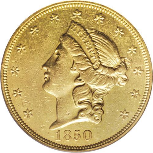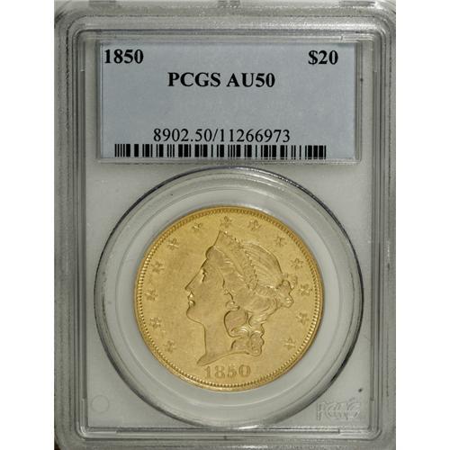<B>1850 $20 AU50 PCGS.</B></I> The portrait and eagle show modest wear, but careful rotation reveals numerous pockets of gently shimmering luster. Small marks are scattered throughout, but none are singularly mentionable. The 1850 is popular as the first collectible date of the denomination.<BR><BR><b>Shipping:</b> Coins & Currency (<a target="_blank" href="http://www.heritageauctions.com/common/shipping.php">view shipping information</a>)