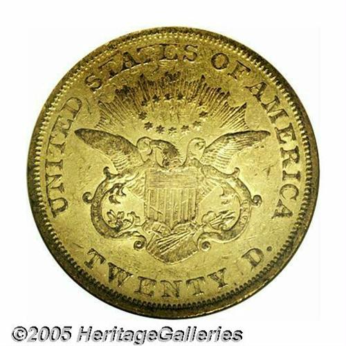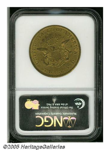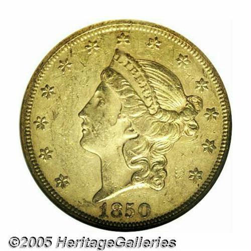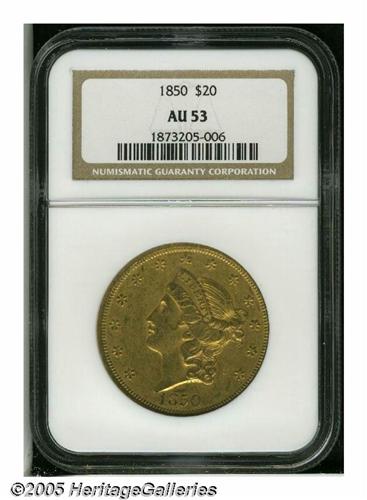 <B>1850<$20> AU53 NGC.</B></I> Generally not found any finer than AU, the 1850 is an immensely popular coin for type purposes. This is an original piece that has an overlay of reddish-gray patina on the highpoints of the devices. Numerous small abrasions are scattered over each side and there is a noticeable amount of mint luster remaining around the margins.