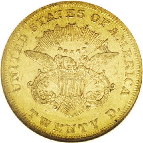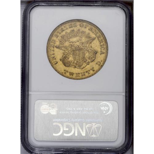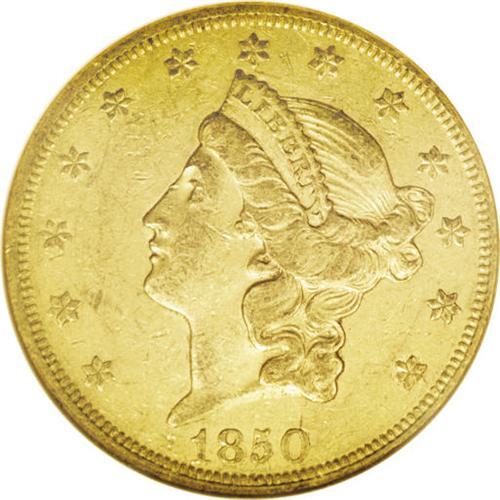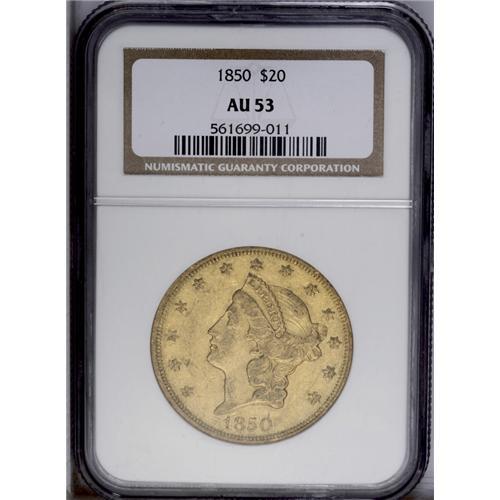 <B>1850<$20> AU53 NGC.</B></I> This early double eagle has light wear on the highpoints and subtly lustrous mustard-yellow surfaces with forest-green highlights. Abrasions in the fields and on the softly struck devices are as expected for a briefly circulated coin. An unusual piece with great eye appeal.