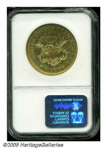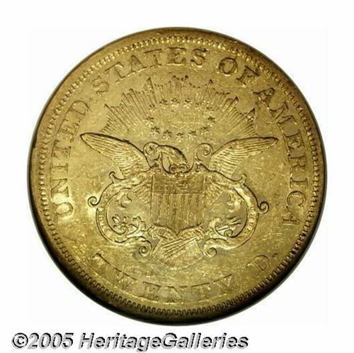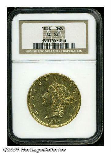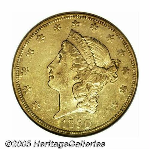 <B>1850<$20> AU53 NGC.</B></I> This is the first year of the regular issue of Double eagles. Moderate surface nicks as nearly always seen on these large, heavy coins, but well struck by the dies and the color is typical light yellow-gold.