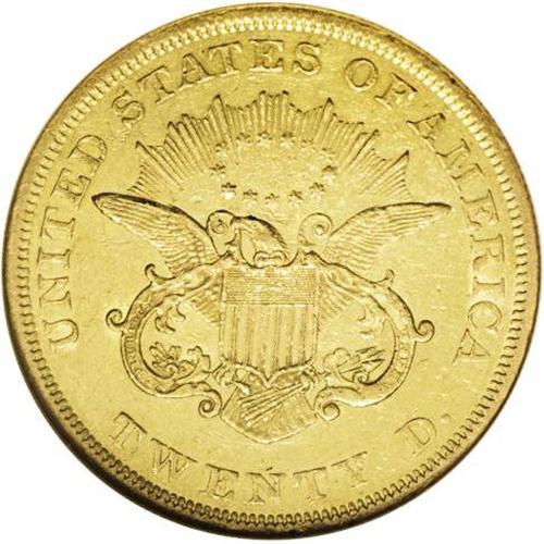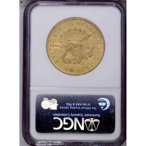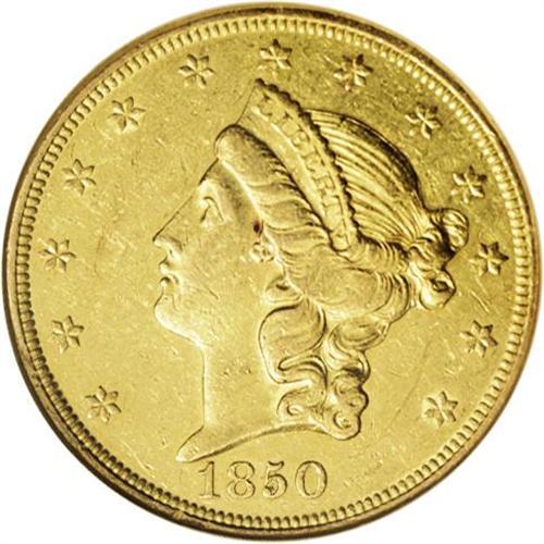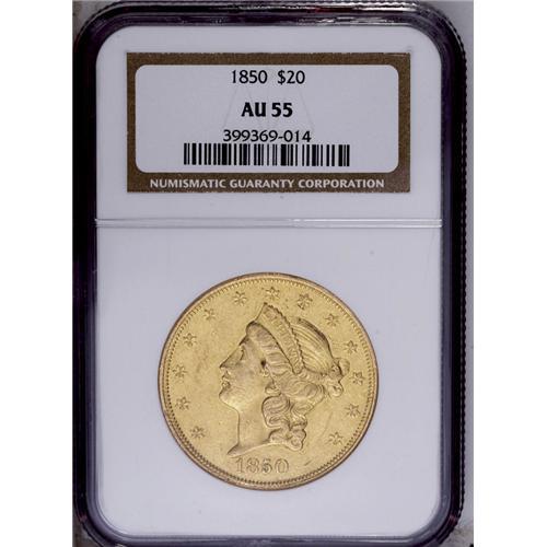 <B>1850<$20> AU55 NGC.</B></I> A bright and well struck honey-gold example of the first collectible Liberty double eagle issue. The distributed obverse marks are customary for the grade and denomination. A small spot is inconspicuously placed near Liberty's temple. Struck from moderately rotated dies.