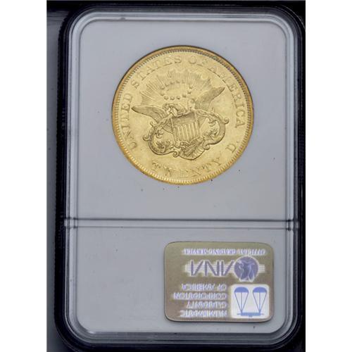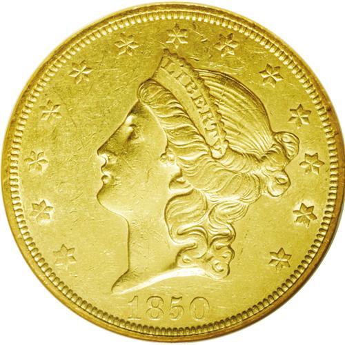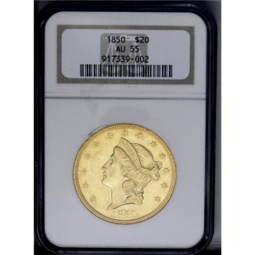 <B>1850<$20> AU55 NGC.</B></I> Subtle greenish-gold color bathes each side. Good remaining detail; a typical count of scattered marks is seen overall. Always popular as a first-year collectible issue.<BR><I>From The Frank Schwerin Collection.</B></I>