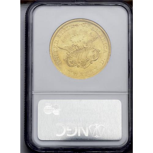 <B>1850<$20> AU55 NGC.</B></I> The 1850 double eagle is quite popular as the first regularly issued double eagle. It is readily located in lower circulated grades, but becomes scarce at the mid-AU level, and very scarce in the high end of this grade range. Bright peach-gold hues enliven each side of this Choice AU example that displays traces of luster in the protected areas. Portions of Liberty's hair are weak, but generally the design features are well detailed. The typical number of abrasions is found over each side.