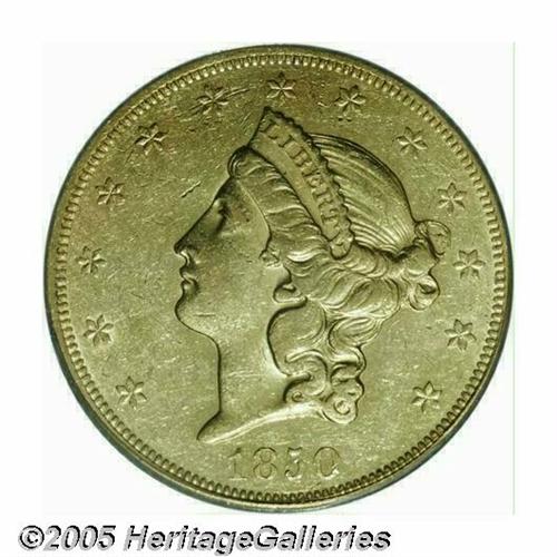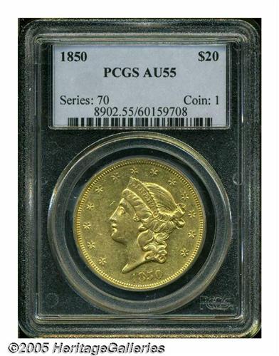 <B>1850<$20> AU55 PCGS.</B></I> A bright Double Eagle with abundant remaining luster and a bold strike. The wingtips and Liberty's curls have a hint of rub, but the fields on each side show myriad minor abrasions. A popular inaugural issue, this example shows some slight counterclockwise die rotation.