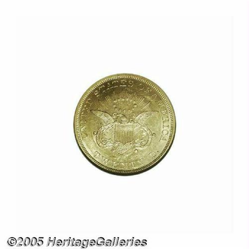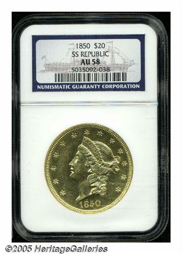 <B>1850<$20> AU58 NGC.</B></I> Ex: S.S. Republic. Popular as a first year of issue, this piece has almost complete mint luster and is sharply defined in all areas. Struck in a bright yellow alloy. Wispy hairlines are prominent in the obverse and reverse fields, and fine die cracks (as struck) connect some of the legends on the reverse. Any damage to the coin from long immersion in sea water seems minimal. A very pleasing example. Population: 100 in 58, 60 finer (6/05).