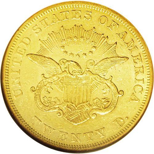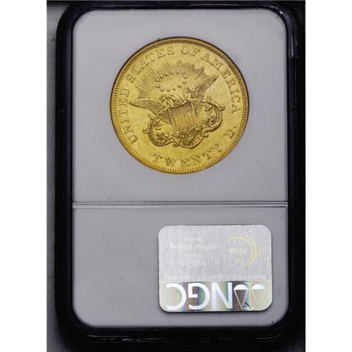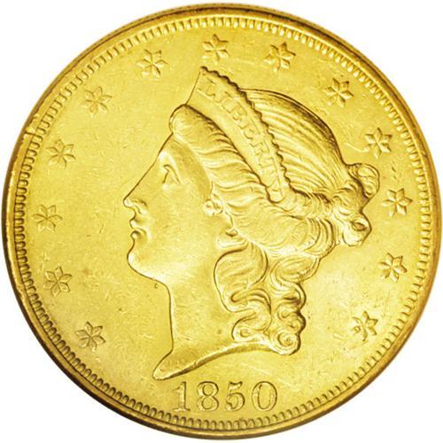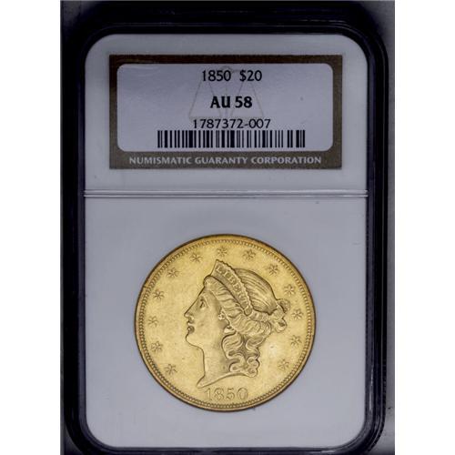 <B>1850<$20> AU58 NGC.</B></I> The 1850 double eagle is typically available in VF or XF grades, but becomes scarce in middle to high-grade AU. The AU58 coin offered here displays traces of luster in the recesses and peach-gold surfaces that show nicely defined design elements. The expected amount of light bagmarks are scattered over each side. The reverse is rotated a few degrees counterclockwise.