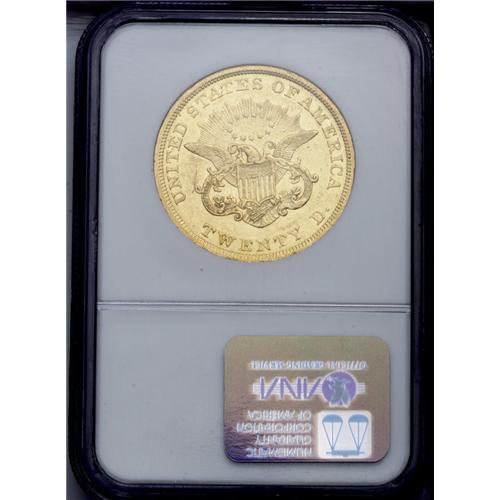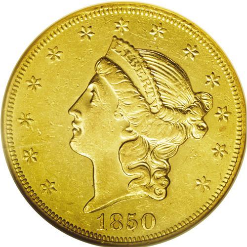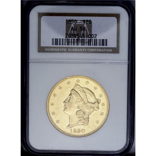 <B>1850<$20> AU58 NGC.</B></I> With the introduction of the new double eagle denomination, this was an important year in American numismatics. Nearly all gold used in coinage now came from the California gold fields. The United States Mint, including all branches, coined a little under 4 million dollars in gold coins in 1848, about 9 million dollars in 1849, and nearly 32 million dollars in 1850. About two-thirds of the 1850 total was in the form of double eagles struck at the Philadelphia Mint. Even more fascinating is an examination of the total production in terms of use, and a comparison to the value of gold today, in 2006. At the current price of $588 per ounce as these words are written, the production of gold coins by the United States Mint in 1850 alone was equivalent to $900 million, up from just $100 million two years earlier.<BR> This is a remarkable example with excellent eye appeal created by light green-gold color and reflective surfaces. Traces of orange toning on the high points, representing traces of wear, add to the overall appearance. The surfaces are lightly abraded, but without taking anything away from the aesthetics of this example. Several references will be important to the study of these double eagles from The Wyoming Collection. Most important among them are <I>A Guide Book of Double Eagle Gold Coins,</B></I> by Q. David Bowers and published in 2004 by Whitman Publishing, LLC; and <I>An Insider's Guide to Collection Type I Double Eagles</B></I> by Douglas Winter and Adam Crum, and published in 2002 by Newport Communications. These will be referenced as Bowers or Winter and Crum in the listings to follow.<BR><I>From The Wyoming Collection.</B></I>