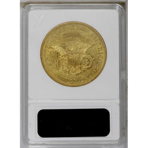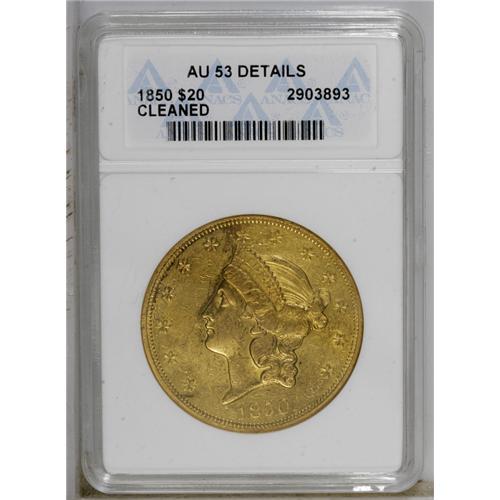 <B>1850<$20>--Cleaned--ANACS. AU53 Details.</B></I> Hints of original luster persist despite moderate cleaning. Minor wear affects most of the yellow-orange surfaces, as do handling marks.