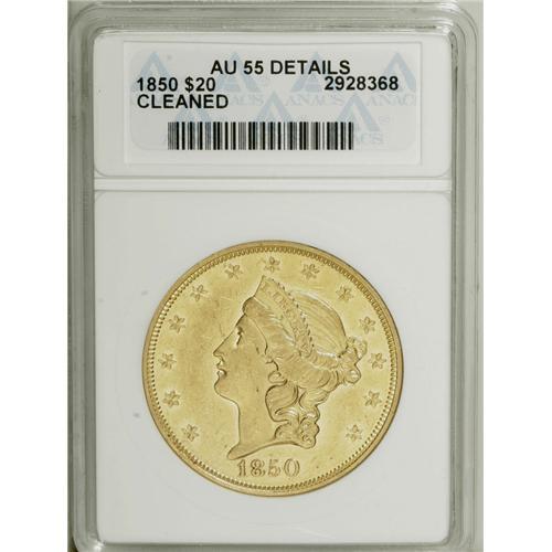 <B>1850 $20 --Cleaned--ANACS. AU55 Details.</B></I> A hint of original luster remains on the reverse of this glossy first-year double eagle. The yellow-gold surfaces have splashes of orange, as well as light handling marks and hairlines.<BR><BR><b>Shipping:</b> Coins & Currency (<a target="_blank" href="http://www.heritageauctions.com/common/shipping.php">view shipping information</a>)