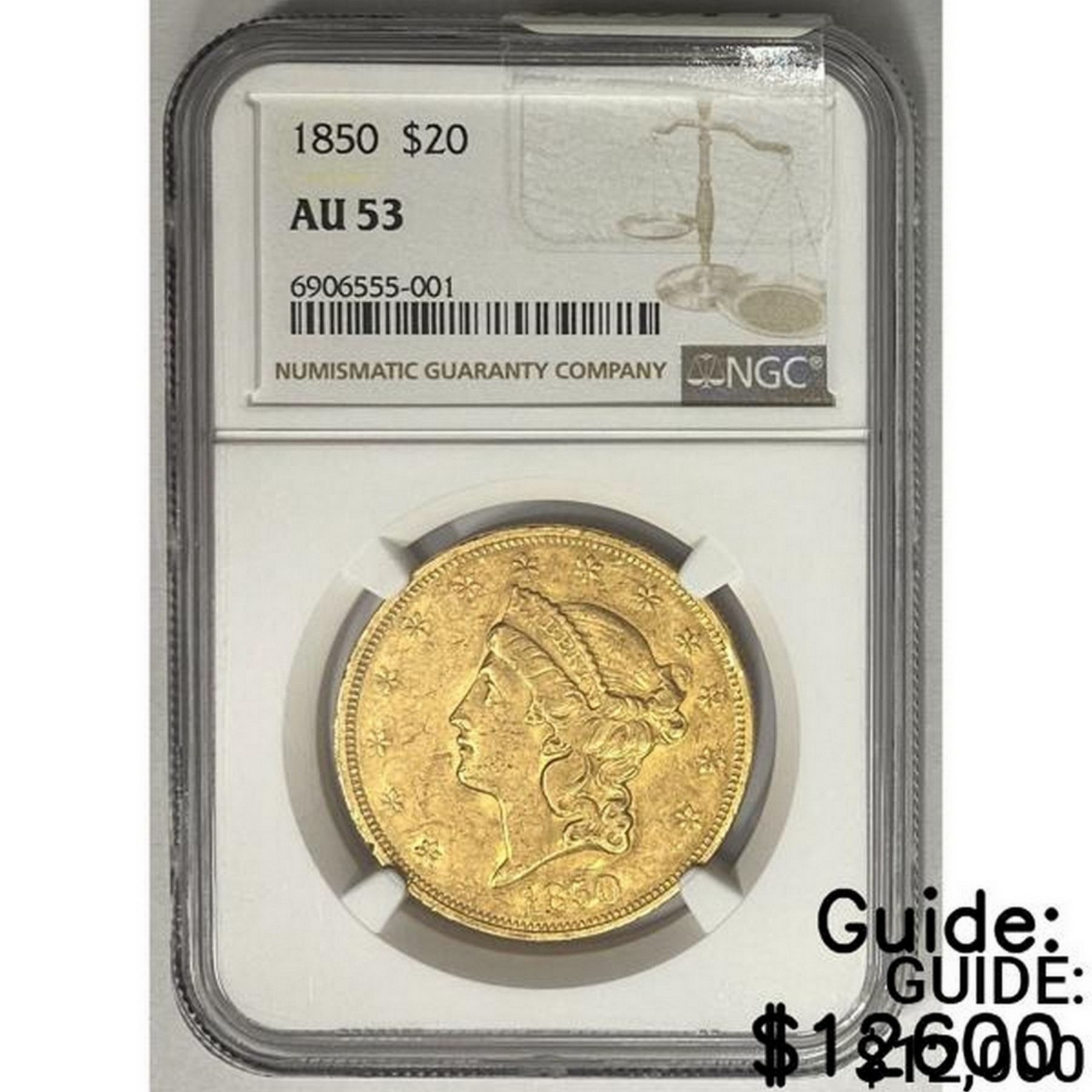 1850 $20 Gold Double Eagle NGC AU53