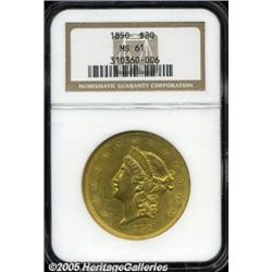 <B>1850 $20 MS61 NGC.</B></I> The first collectible Liberty Double Eagle from the Philadelphia mint, the 1850 is a fairly plentiful issue in circulated grades. The certified population does, however, drop off rapidly as one crosses the Mint State threshold. This is an exceptionally well produced coin whose devices exhibit pinpoint striking definition. The luster is smooth and frosty with modest brightness in the fields. There are a few minor abrasions that are typical for the grade, but warm, green-gold color provides memorable eye appeal. Population: 25 in 61, 28 finer (2/05).