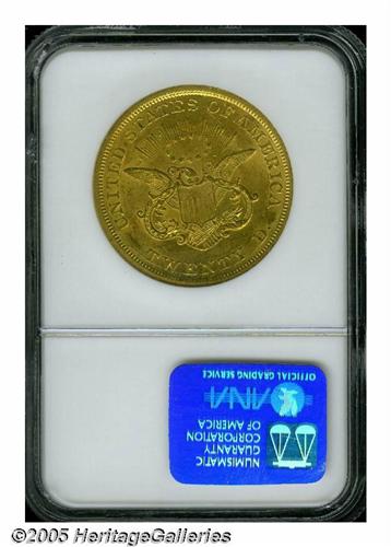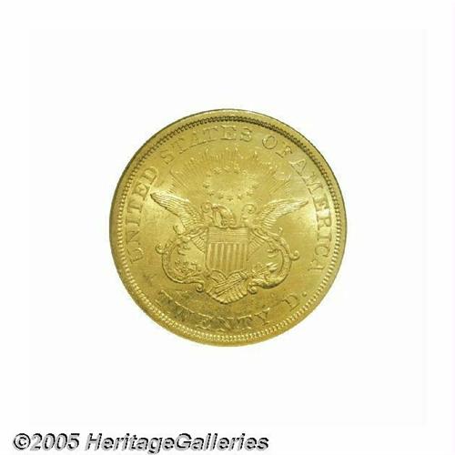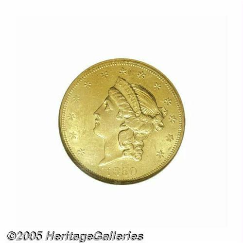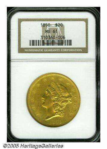 <B>1850<$20> MS61 NGC.</B></I> The first collectible Liberty Double Eagle from the Philadelphia mint, the 1850 is a fairly plentiful issue in circulated grades. The certified population does, however, drop off rapidly as one crosses the Mint State threshold. This is an exceptionally well produced coin whose devices exhibit pinpoint striking definition. The luster is smooth and frosty with modest brightness in the fields. There are a few minor abrasions that are typical for the grade, but warm, green-gold color provides memorable eye appeal. Population: 27 in 61, 30 finer (6/05).
