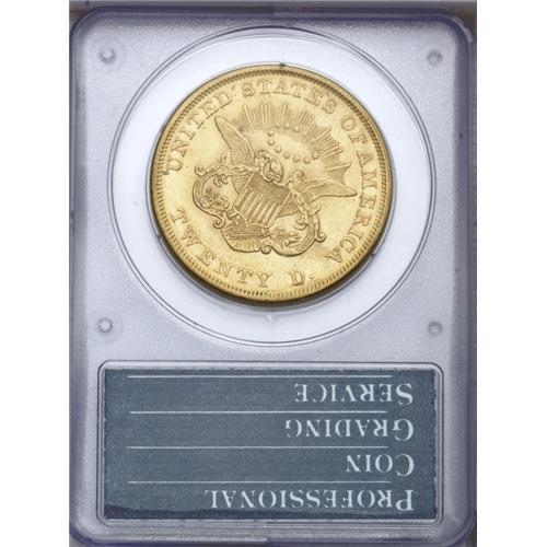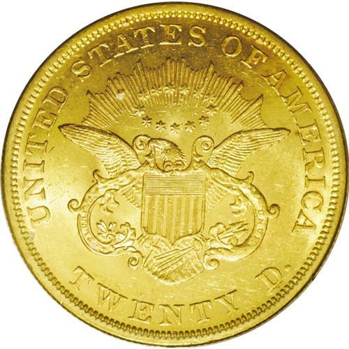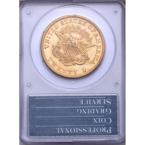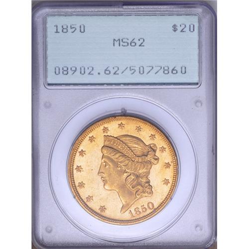 <B>1850<$20> MS62 PCGS.</B></I> A remarkable example of the first double eagle issue of the United States Mint. Although this issue is not particularly rare when all grades are considered, it is elusive in Mint States grades. From a mintage of 1.1 million coins, Q. David Bowers estimated a total surviving population of 3,000 to 5,000 circulated coins, but only 30 to 50 Mint State coins. In <I>A Guide Book of Double Eagle Gold Coins,</B></I> Bowers recorded a "field population" for each date, giving separate figures for circulated and Mint States categories. This was his estimate of the total surviving number of coins currently in the hands of collectors, investors, and other parties. As he noted in his book: "no account is made for undiscovered hoards, if any exist."<BR> This is an impressive Mint State example housed in a first generation PCGS holder. The surfaces are fully brilliant with highly lustrous yellow-gold color. It is nicely centered with all details brought up to their fullest advantage. The obverse, especially, has a nice cameo appearance with frosty devices and satiny, almost prooflike fields. A remarkable example with few finer quality pieces known. Population: 22 in 62, 8 finer (6/06).