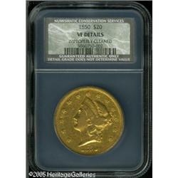 <B>1850 $20 VF Details, Improperly Cleaned, NCS.</B></I> A bright representative that has a typically abraded obverse field and a patch of wispy hairlines on the lower reverse, near some freckles of orange-red patina. The reverse rim has a small cut at 10 o'clock and a minor ding at 3 o'clock.<BR><I>From The Mike Jacobson Collection.</B></I> Lot:8914