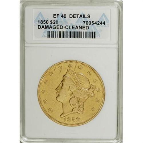 <B>1850 $20 --Cleaned, Damaged--ANACS. XF40 Details.</B></I> NGC Census: (98/845). PCGS Population (103/450). Mintage: 1,170,261. Numismedia Wsl. Price for NGC/PCGS coin in XF40: $1,125. (#8902)<BR><BR><B>Coin Engraver:</B> James B. Longacre<BR><BR><b>Shipping:</b> Coins & Currency (<a target="_blank" href="http://www.heritageauctions.com/common/shipping.php">view shipping information</a>)
