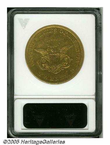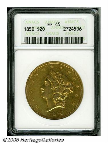 <B>1850<$20> XF45 ANACS.</B></I> Popular as a first year of issue, this piece has lovely rich green-gold and reddish color, and is evenly worn with plenty of remaining detail, for the grade. A very pleasing example.<BR><I>From the Dr. Kurt Peters Collection.</B></I> From the Dr. Kurt Peters Collection.