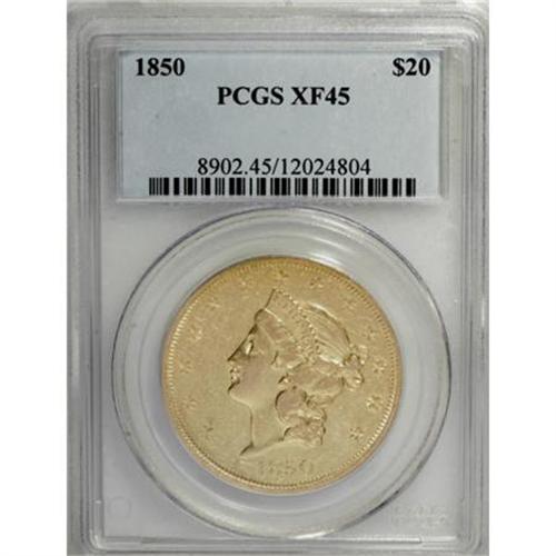 <B>1850 $20 XF45 PCGS.</B></I> The still-lustrous fields of this Choice XF piece show numerous light abrasions on each side. The lemon-gold portrait shows typical softness, combined with light highpoint wear. Overall, a pleasing representative of this first circulation-strike double eagle issue.<BR><BR><B>Coin Engraver:</B> James B. Longacre<BR><BR><b>Shipping:</b> Coins & Currency (<a target="_blank" href="http://www.heritageauctions.com/common/shipping.php">view shipping information</a>)