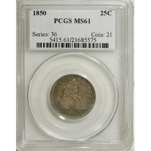 <B>1850 25C MS61 PCGS.</B></I> Breen-3979. Part of Extra 1 in Border. Breen describes this variety as "Extremely Rare." Although it may not be quite so rare, there is no doubt that full Mint State examples are especially important.<BR> Slate-gray and cobalt-blue patination dominates each side. The design elements are well struck, and the somewhat muted surfaces reveal just a few minute marks.<BR><BR><b>Shipping:</b> Coins & Currency (<a target="_blank" href="http://www.heritageauctions.com/common/shipping.php">view shipping information</a>)