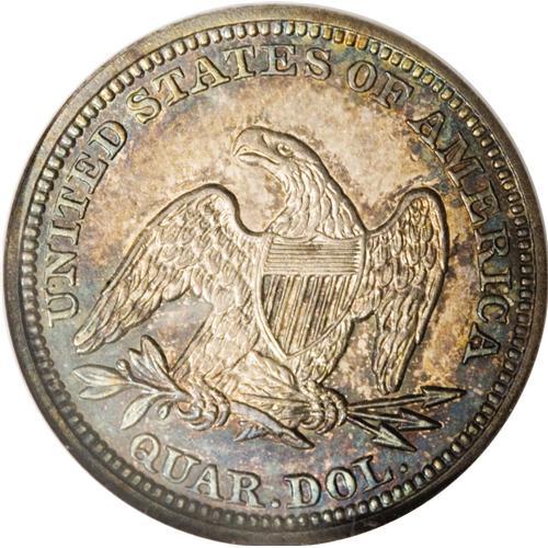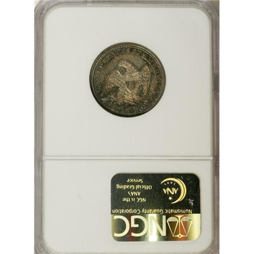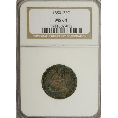 <B>1850 25C MS64 NGC.</B></I> A sharply detailed near-Gem with rich gold, blue, and iridescent toning. Many years ago, perhaps early in the 20th century, dealers might have called this piece a proof, based upon its overall quality. It is a lovely piece, and elusive in such grades. Census: 7 in 64, 4 finer (3/07).<BR><BR><b>Shipping:</b> Coins & Currency (<a target="_blank" href="http://www.heritageauctions.com/common/shipping.php">view shipping information</a>)