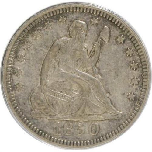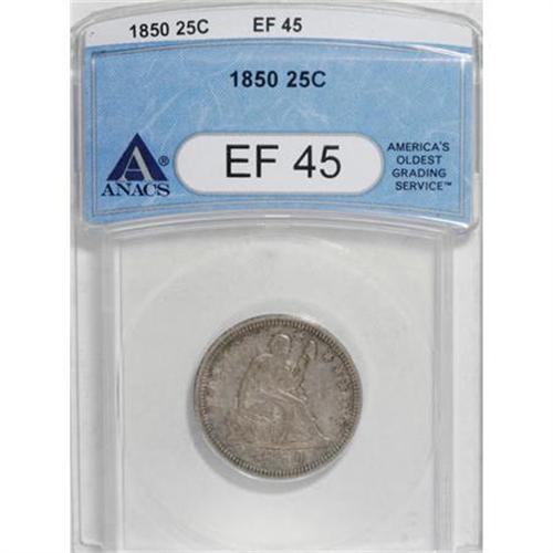<B>1850 25C XF45 ANACS.</B></I> NGC Census: (2/26). PCGS Population (2/27). Mintage: 190,800. Numismedia Wsl. Price for NGC/PCGS coin in XF45: $214. (#5415)<BR><BR><B>Coin Engraver:</B> Christian Gobrecht<BR><BR><b>Shipping:</b> Coins & Currency (<a target="_blank" href="http://www.heritageauctions.com/common/shipping.php">view shipping information</a>\)