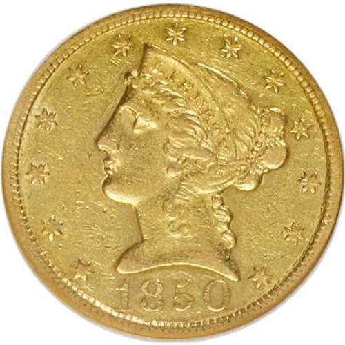 <B>1850 $5 AU50 NGC.</B></I> NGC Census: (13/66). PCGS Population (12/26). Mintage: 64,400. Numismedia Wsl. Price for NGC/PCGS coin in AU50: $740. (#8243)<BR><BR><B>Coin Engraver:</B> Christian Gobrecht<BR><BR><b>Shipping:</b> Coins & Currency (<a target="_blank" href="http://www.heritageauctions.com/common/shipping.php">view shipping information</a>\)
