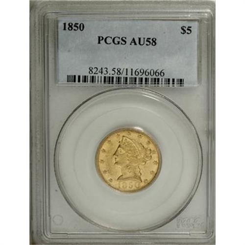 <B>1850 $5 AU58 PCGS.</B></I> Brassy-gold surfaces retain a fair amount of luster, and exhibit well defined design features. A few light marks are evenly distributed over both faces.<BR><BR><B>Coin Engraver:</B> Christian Gobrecht<BR><BR><b>Shipping:</b> Coins & Currency (<a target="_blank" href="http://www.heritageauctions.com/common/shipping.php">view shipping information</a>)