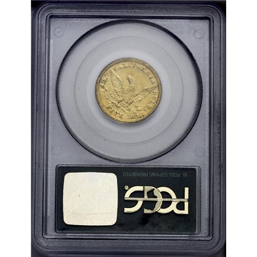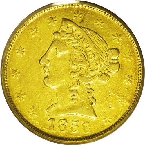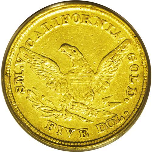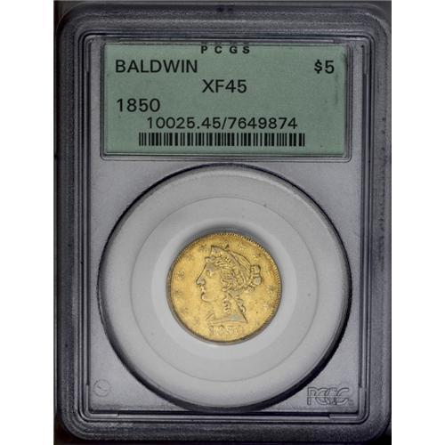 <B>1850<$5> Baldwin Five Dollar XF45 PCGS.</B></I> K-2, R.5. All Baldwin & Co. private gold coins are elusive today. Donald Kagin recorded four different varieties (in addition to a unique ingot), with a total population of about 100 coins. The Baldwin five dollar piece is easily the most available of these four varieties, encompassing approximately half of the total population.<BR> The firm of Baldwin & Co., operated by George Baldwin, acquired the coining equipment of F.D. Kohler in March 1850, and commenced their own coinage operation a short time later. A substantial mintage of gold coins took place at the offices of George Baldwin, including $590,000 in coin during the first quarter of 1851, alone. Few of these pieces remain due to publication of "The Gold Swindle" by James King of William, a contemporary rival of Baldwin and other firms that were targeted. King was responsible for assays of various gold coins including the Baldwin pieces, and published the results of these assays, stating the pieces tested did not hold up to standard, and that they should not be accepted in transactions. As a result, the Baldwin coinage did not circulate widely, and nearly all was eventually melted with the gold recoined at the U.S. Assay Office or, later, the San Francisco Mint.<BR> This example, which has probably been cleaned a long time ago, retains the rich greenish-gold color that is typical of most California gold coinage. The surfaces are moderately abraded, suggesting that this particular example did spend considerable time in circulation. The reverse has a small rim break over M of SMV. Listed on page 355 of the 2007 <I>Guide Book.</B></I><BR><I>From The Carolina Gold Collection, Part Four.</B></I>