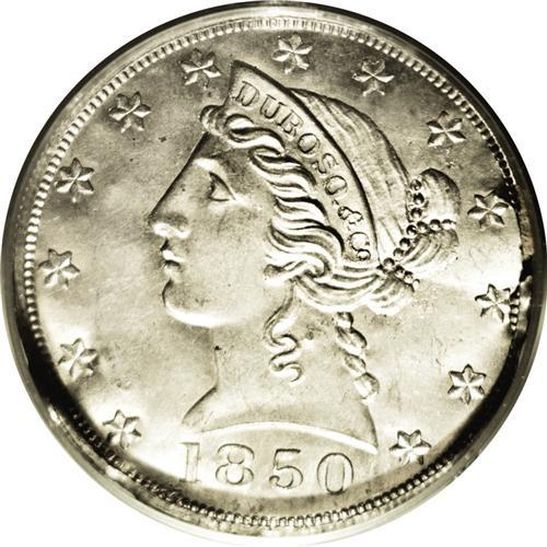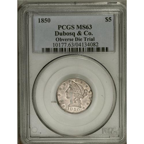 <B>1850<$5> Dubosq & Co. Five Dollar Obverse and Reverse Die Trials MS63 PCGS.</B></I> K-3 and K-3a, R.8. For most collectors of territorial coinage, this pair of splashers is about as close as they will get to the actual coins of Theodore Dubosq. Like other private minters in Gold Rush California, Dubosq's coins were assayed by Augustus Humbert and found to have $4.96 in gold. This result was published in the <I>Alta California,</B></I> and Dubosq protested that the silver contained in the coins brought their intrinsic value to more than face value. While this was true, Humbert lacked sufficient parting acids to perform such a test--his response was the cost of extracting the silver alloy was worth more than the silver recovered. The results were predictable with the Dubosq firm suffering a loss of public confidence. Many of their coins were returned and melted, and very few remain today.<BR> One note worthy of mention is that the engraver of the 1850 dies may have been James Longacre. Patterns were found in his estate (these pieces perhaps?) and close inspection shows a remarkable similarity between the devices on these splashers and federal half eagles of the period.<BR> Struck in white metal, these pieces retain almost complete brightness of the white metal composition. The thin metal on which they were struck show the waviness seen on splashers, and the obverse pressing seems to have remnants of paper on the back. Of the greatest importance to collectors of territorial gold and significant rarities in their right, splashers such as these give the numismatist a rare insight into the production of these historic coins.