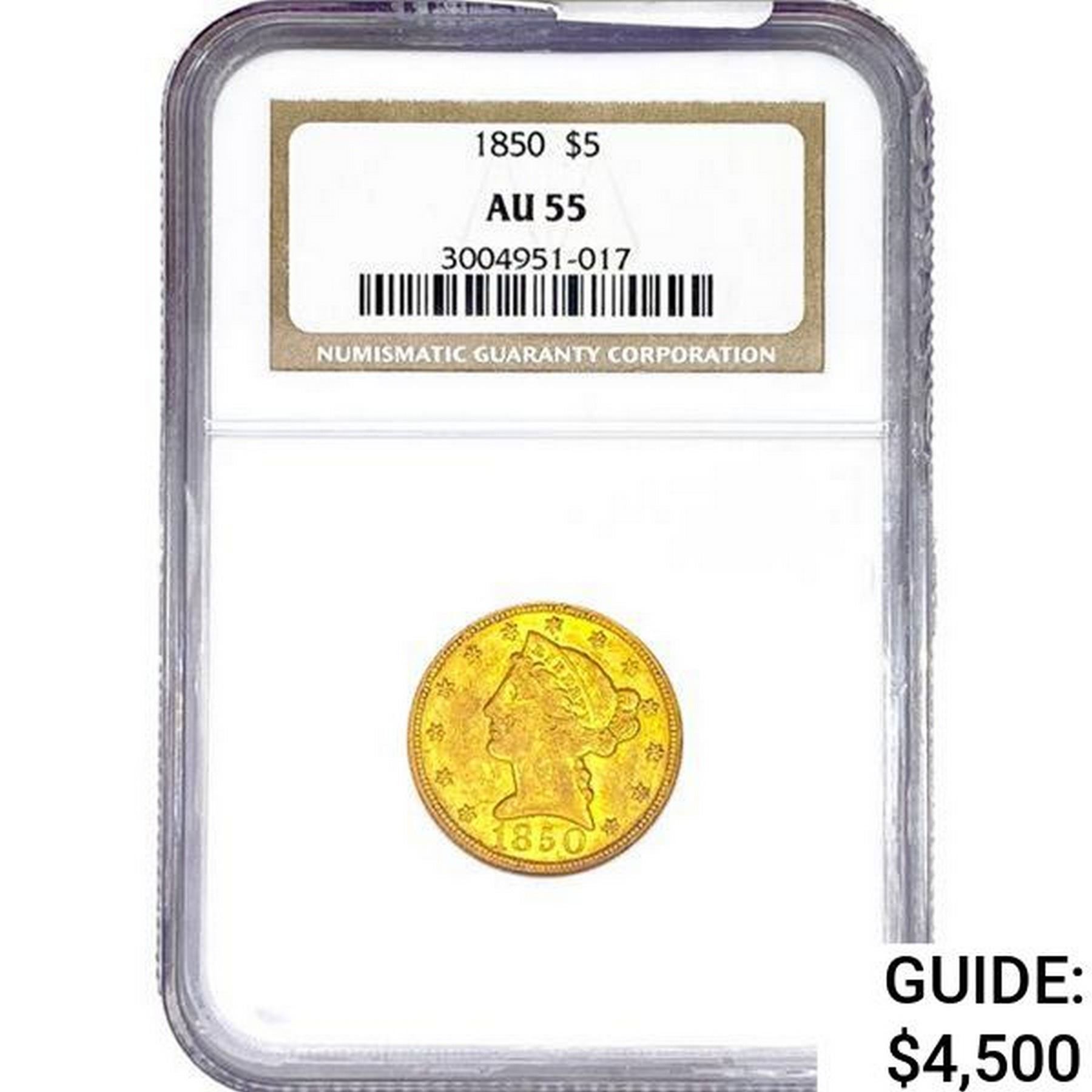 1850 $5 Gold Half Eagle NGC AU55