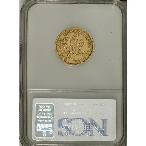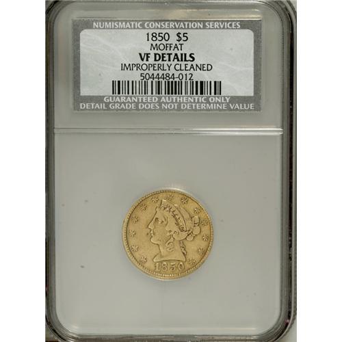 <B>1850 $5 Moffat & Co. Five Dollar--Improperly Cleaned--NCS. VF Details.</B></I> "K-7b", R.4. This die marriage is photographed under Breen-7785, but not in the standard Kagin reference. A hairlined and glossy example, but the legends and types are clear, and there are no mentionable marks. Struck from widely rotated dies. Listed on page 348 of the 2007 <I>Guide Book.</B></I><BR><BR><b>Shipping:</b> Coins & Currency (<a target="_blank" href="http://www.heritageauctions.com/common/shipping.php">view shipping information</a>)