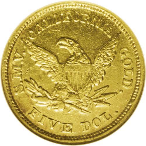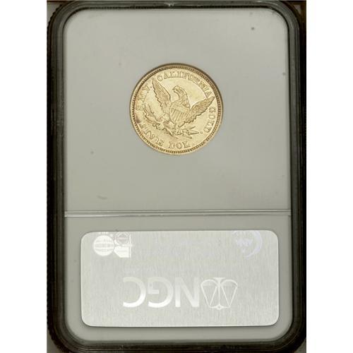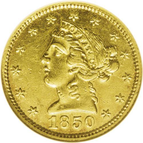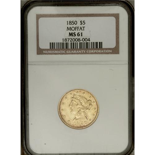 <B>1850<$5> Moffat & Co. Five Dollar MS61 NGC.</B></I> "K-7b," R.4. A Large Eagle variant of K-7a. The reverse die is similar, but the berry is directly centered above the I in FIVE, unlike the Kagin-7a plate. This attractive privately coined half eagle has noticeable remaining luster, and the borders display glimpses of tan-russet toning. Aside from softness on the vertical shield stripes, which are opposite the high shelf of hair above the ear, the strike is as bold as the crude dies allow. Moffat & Co. was an early and respected West Coast private coiner, and their facilities were used by U.S. Assayer Augustus Humbert and later, by the U.S. Assay Office of Gold. Listed on page 348 of the 2007 <I>Guide Book.</B></I>