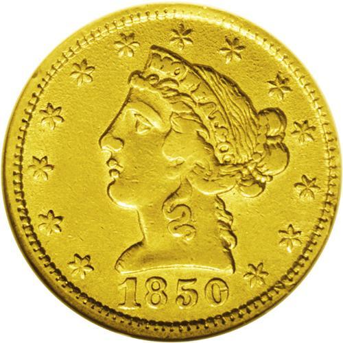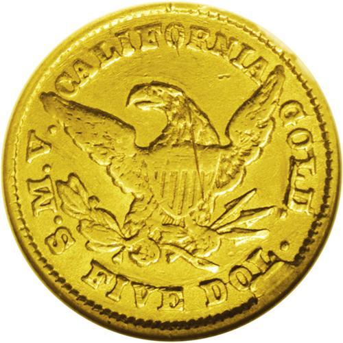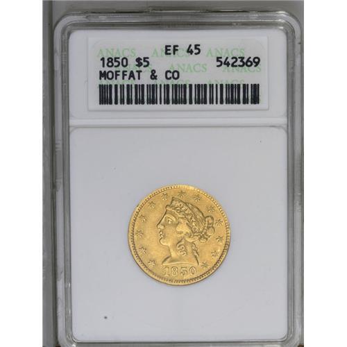 <B>1850<$5> Moffat & Co. Five Dollar XF45 ANACS.</B></I> "K-7c." Not plated in the Kagin reference, but this Large Eagle variety is similar to K-7a, and the retained cud on the OL in DOL is referred to under Die State C. The strike is bold at the borders, and soft in the centers. The reverse has noticeable marks, including a thin scratch on the eagle's shield.<BR><I>From The Carolina Gold Collection, Part Four.</B></I>