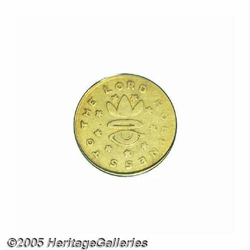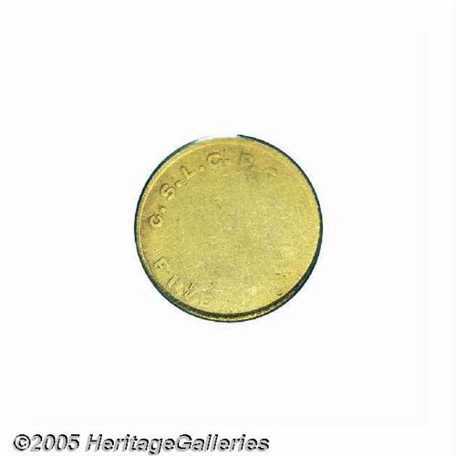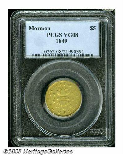 <B>1850<$5> Mormon Five Dollar VG8 PCGS.</B></I> K-5, High R.5. Misattributed by PCGS as an 1849 Mormon $5. The 1850 Mormon Half Eagle differs primarily from the 1849 issue as it has a redesigned obverse with an all-seeing eye, nine stars surrounding it, and a differently styled miter cap. Many survivors are in well circulated grades. The minters were ordered to alloy the 1850 issue with silver in order to bring up their value relative to the 1849 issue, but this effort failed, and the vast majority of these underweight coins were melted by assayers in the 1850s. The central reverse is well worn; the date and clasped hands are not apparent. The obverse is comparatively sharp and has clear legends. Listed on page 308 of the 2005 <I>Guide Book.</B></I><BR><I>From The Great Western Collection of Territorial Gold.</B></I>