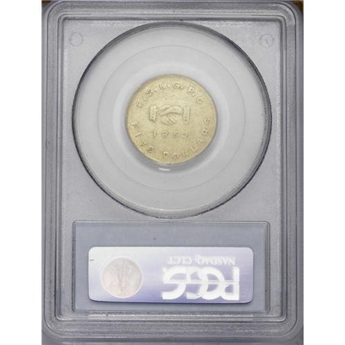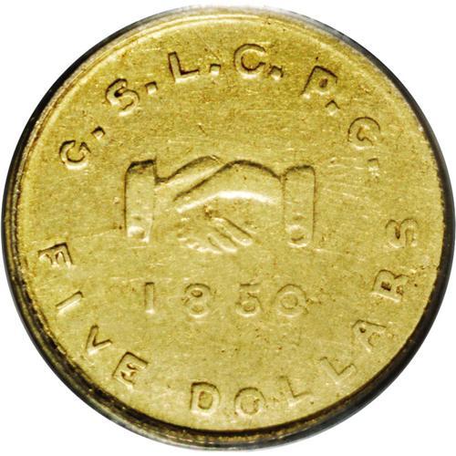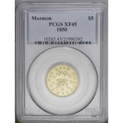 <B>1850<$5> Mormon Five Dollar XF45 PCGS.</B></I> K-5, High R.5. Similar in designs to the 1849 issue half eagle, but the obverse die has an additional halo or crown over the eye, below the three pointed hat. Once it was discovered that the Mormon issues were light in weight and debased in fineness, few merchants would accept them even at a discount. Most were eventually melted to reclaim their bullion. The handful of these that did survive were likely saved by Mormons as keepsakes of this historic time. This lightly marked olive-gold example is carefully impressed by the dies and has a clean appearance. Many Mormons from Utah Territory spent time in California seeking gold or supporting the miners, because of their relative proximity to San Francisco and the gold fields. These historic coins have always been popular with Territorial gold collectors. Listed on page 361 of the 2006 <I>Guide Book.</B></I>