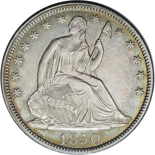 <B>1850<50C>--Improperly Cleaned--NCS. AU Details.</B></I> Iridescent pale peach, steel-blue, and olive-brown colors embrace this sharply struck representative. Near Mint in terms of wear, but the fields are cloudy with faint hairlines. The matte-like texture on the Seated Liberty is as made. The 1850 had the lowest Philadelphia Mint production since a fire at the mint prevented coinage of the denomination in 1816. This reduced mintage was likely due to the success of the California gold mining camps, which affected the relative gold and silver valuation. There was little economic sense in striking silver coins with a bullion value above face.