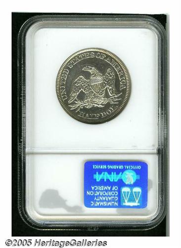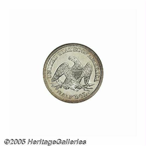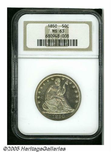 <B>1850<50C> MS63 NGC.</B></I> WB-101. The 1850 has a mintage of 227,000 pieces, which is low for a Philadelphia Mint issue of the era. The issue carries a substantial premium in all grades, and is very scarce in Mint State. This rather prooflike example has light gold toning and a hint of frost on the devices. Minor marks are here and there, but none singularly distract. Well struck aside from the eagle's left (facing) ankle. The Seated Liberty device has a pebbled appearance, as made. Population: 14 in 63, 2 finer (6/05).