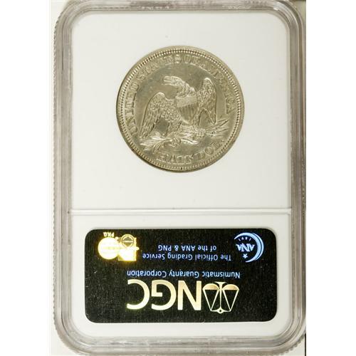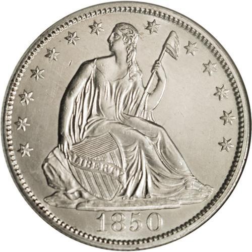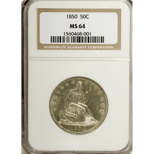 <B>1850 50C MS64 NGC.</B></I> From 1850 until the weight change of 1853, the Philadelphia Mint's output of half dollars shrank considerably from its previous heights. In 1850, the mintage consisted of only 227,000 halves, and of them, this piece is one of the finest to have escaped the melting pot. The pink-tinged silver surfaces have soft but pleasing luster, and the strike is solid. Only a small abrasion at Liberty's midsection precludes a Gem grade. This remarkable example is tied for the finest certified by NGC (1/07).<BR><BR><b>Shipping:</b> Coins & Currency (<a target="_blank" href="http://www.heritageauctions.com/common/shipping.php">view shipping information</a>)