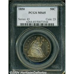 <table><tbody><tr><td><table> <TR><TD width="100%"><TABLE cellSpacing=1 cellPadding=3 width="100%" border=0><TBODY><TR><TD width="100%" bgColor=#79735c><FONT face=arial color=#ffffff size=3><B>Description</B> </FONT></TD></TR><TR><TD width="100%" bgColor=#ffffff><FONT face=arial size=2><B>1850 50C MS65 PCGS.</B></I> The 1850 is an important condition rarity among early Seated Liberty Half Dollar issue, being far more difficult in all grades than its rather modest production of 227,000 pieces would suggest. Only a few dozen Mint State pieces are believed to survive and the quantity of Gems such as this coin can probably be counted on one hand. Not only is the scintillating luster a noteworthy characteristic of this remarkable example, but eye appealing flashes of deep crimson, orange, and electric-blue iridescence cling to the devices on both sides. All details are sharply struck, although we note the normal evidence of die rust on the portrait. An exciting offering for the quality conscious Seated Liberty collector. Population: 1 in 65 (2 at NGC), 1 finer (11/03). </FONT></TD></TR></TBODY></TABLE></TD></TR></TBODY></TABLE><BR><A name=PricesRealized></A><TABLE cellSpacing=0 cellPadding=0 width="100%" bgColor=#000000 border=0><TBODY><TR><TD width="100%"><TABLE cellSpacing=1 cellPadding=3 width="100%" border=0><TBODY><TR><TD width="100%" bgColor=#79735c><A name=PR><FONT face=arial color=#ffffff size=3><B>Previous Prices from Heritage Auctions</B> </FONT></A></TD></TR><TR><TD bgColor=#f6f6ed>No Prior Data Recorded </TD></TR><TR><TD bgColor=#ffffff><FONT face=arial size=1 ?>PLEASE NOTE: All prices realized reflect the final hammer price PLUS the buyer's premium in auctions that charge a buyer's premium. Each item has a notation at the top of the listing indicating whether that lot included a buyer's premium. Example: A item that sells with a final hammer price of $100 and a 20% buyer's premium will display with a price realized of $120. All information listed is intended to be as accurate as possible, but errors are possible. Please use this guide carefully and inform us of any inaccuracies. </FONT></TD></TR></TBODY></TABLE></TD></TR></TBODY></TABLE><BR><TABLE cellSpacing=0 cellPadding=0 width="100%" bgColor=#000000 border=0><TBODY><TR><TD width="100%"><TABLE cellSpacing=1 cellPadding=3 width="100%" border=0><TBODY><TR><TD width="100%" bgColor=#79735c colSpan=6><FONT face=arial color=#ffffff size=3><B>Price Guide*</B> </FONT></TD></TR><TR bgColor=#f6f6ed><TD align=middle><B>Grade</B> </TD><TD align=middle><B>Coin World<BR>(Trends)</B> </TD><TD align=middle><B>Numismedia<BR>Retail</B> </TD><TD align=middle><B>Numismedia<BR>Wholesale</B> </TD><TD align=middle><B>Coin<BR>Universe</B> </TD><TD align=middle><B>Heritage<BR>Value Index</B> </TD></TR><TR bgColor=#ffffff><TD align=middle>64</TD><TD align=right>---</TD><TD align=right>---</TD><TD align=right>---</TD><TD align=right>---</TD><TD align=right>---</TD></TR><TR style="FONT-WEIGHT: bold" bgColor=#cccfdd><TD align=middle>65</TD><TD align=right>---</TD><TD align=right>---</TD><TD align=right>---</TD><TD align=right>---</TD><TD align=right>---</TD></TR><TR bgColor=#ffffff><TD align=middle>66</TD><TD align=right>---</TD><TD align=right>---</TD><TD align=right>---</TD><TD align=right>---</TD><TD align=right>---</TD></TR><TR bgColor=#ffffff><TD colSpan=6><FONT size=1>*All information listed is intended to be as accurate as possible, but errors are possible. No item may be returned or refused based on this information which is provided as a service to our customers. You should contact each pricing source directly to determine the accuracy of this information. </FONT></TD></TR></TBODY></TABLE></TD></TR></TBODY></TABLE><BR><TABLE cellSpacing=0 cellPadding=0 width="100%" bgColor=#000000 border=0><TBODY><TR><TD width="100%"><TABLE cellSpacing=1 cellPadding=3 width="100%" border=0><TBODY><TR><TD width="100%" bgColor=#79735c><FONT face=arial color=#ffffff size=3><B>Population Guide</B> </FONT></TD></TR><TR bgColor=#ffffff><TD align=middle><!-- Begin Output of Population Grid--><TABLE cellSpacing=0 cellPadding=0 width="100%" border=0><TBODY><TR><TD vAlign=center><TABLE cellSpacing=0 width="100%" border=1 cellsadding="3"><TBODY><TR><TD vAlign=center><TABLE cellSpacing=0 cellPadding=3 width="100%" border=1><TBODY><TR><TD vAlign=center align=middle bgColor=#f0f1e8 colSpan=2 <CENTER><FONT face=Arial size=2><B>PCGS Pop </B></FONT><CENTER></CENTER></TD><TD vAlign=center align=middle bgColor=#f0f1e8 colSpan=2><CENTER><FONT face=Arial size=2><B>NGC Pop</B></CENTER></FONT></TD></TR><TR><TD vAlign=center><FONT face=Arial size=2>(65)</FONT> </TD><TD vAlign=center align=right><FONT face=Arial size=2>0</FONT> </TD><TD vAlign=center><FONT face=Arial size=2>(65)</FONT> </TD><TD vAlign=center align=right><FONT face=Arial size=2>2</FONT> </TD></TR><TR><TD vAlign=center><FONT face=Arial size=2>(>65)</FONT> </TD><TD vAlign=center align=right><FONT face=Arial size=2>1</FONT> </TD><TD vAlign=center><FONT face=Arial size=2>(>65)</FONT> </TD><TD vAlign=center align=right><FONT face=Arial size=2>0</FONT> </TD></TR></TBODY></TABLE></TD></TR></TBODY></TABLE></TD></TR></TBODY></TABLE><!-- End Output of Population Grid--></TD></TR></TBODY></TABLE></TD></TR></TBODY></TABLE><BR><TABLE cellSpacing=0 cellPadding=0 width="100%" bgColor=#000000 border=0><TBODY><TR> <font color='#000000'><span style='background-color: #FFFFFF'><td bgcolor='#FFFFFE'> Important notice: Heritage usually auctions material at the rate of 200-250 lots per hour. On some occasions eBay Live bid software or the Internet may not be able to keep up with the pace of the auction. We recommend placing a realistic absentee bid now as insurance to avoid disappointment. Occasionally the auctioneer may eliminate or reject an eBay Live bid, and the auctioneer may also reopen a lot after the close of the eBay live bidding (usually because we missed an audience bid), and may reject your bid even if it shows you as the winning b