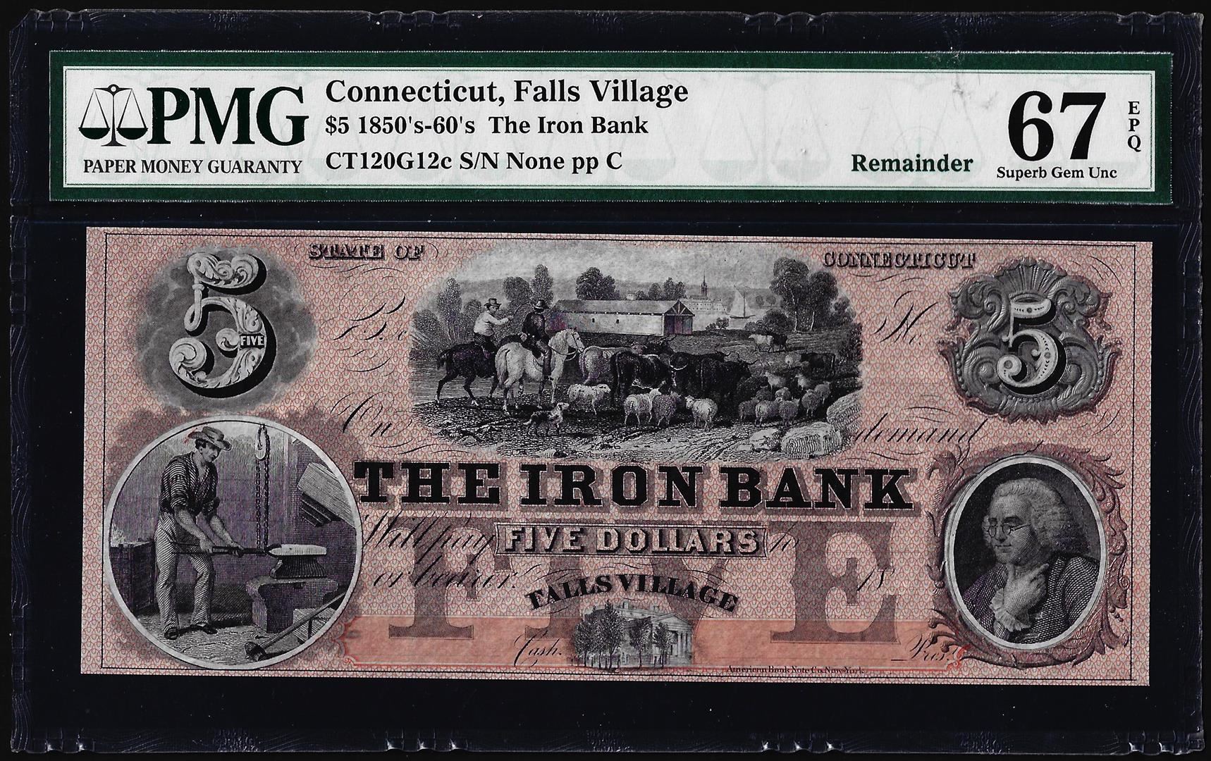 1850-60's $5 The Iron Bank Falls Village, CT Obsolete Note PMG Superb Gem Unc 67EPQ