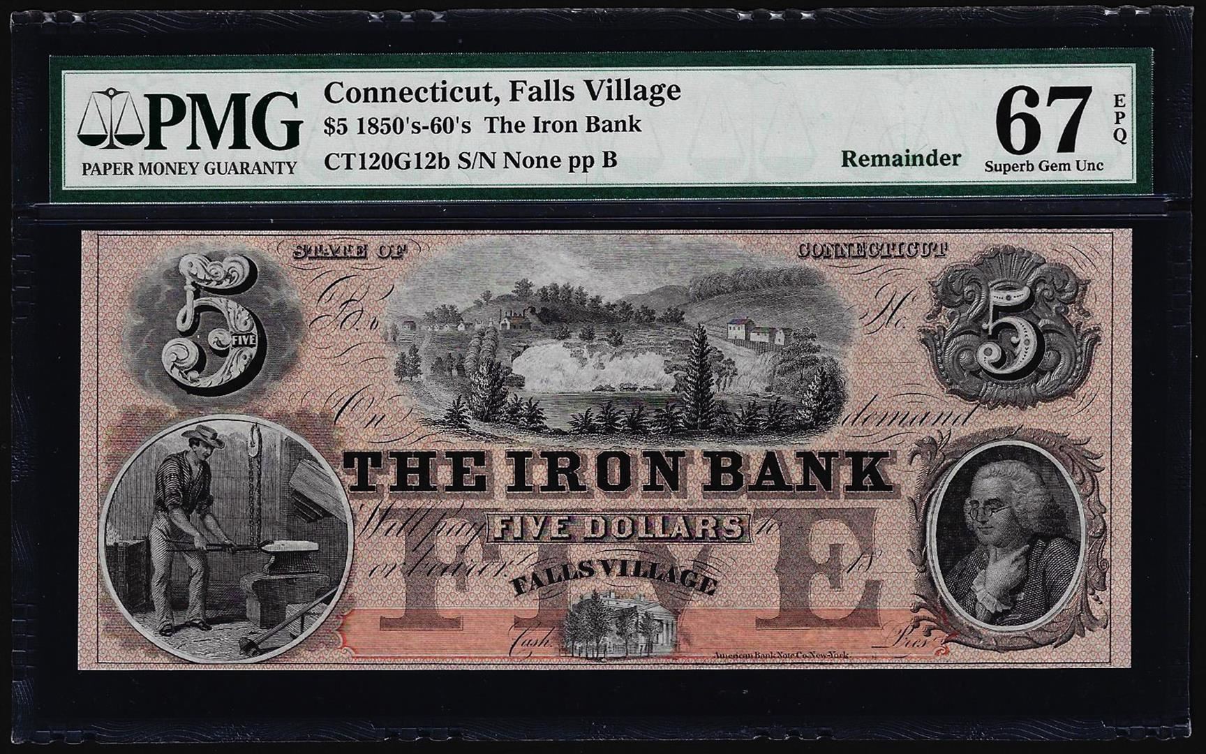 One 1850-60's $5 The Iron Bank Falls Village, CT Obsolete Note PMG Superb Gem Unc 67EPQ. PMG Certified.