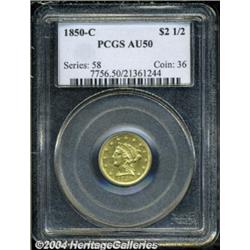 <table><tbody><tr><td><table> <TR><TD width="100%"><TABLE cellSpacing=1 cellPadding=3 width="100%" border=0><TBODY><TR><TD width="100%" bgColor=#79735c><FONT face=arial color=#ffffff size=3><B>Description</B> </FONT></TD></TR><TR><TD width="100%" bgColor=#ffffff><FONT face=arial size=2><B>1850-C $2 1/2 AU50 PCGS.</B></I> Variety 12-H. Most easily attributed by the upper part of the mintmark that is merged with the feathers. Only 9,148 pieces were struck of the issue and the vast majority are in the VF-XF grade range. This bright green-gold example shows some softness on the hair over Liberty's face and on the eagle's plumage, and there are no singularly mentionable abrasions on either side.<BR><I>From The New Millennium Collection, Part 3.</B></I> </FONT></TD></TR></TBODY></TABLE></TD></TR></TBODY></TABLE><BR><A name=PricesRealized></A><TABLE cellSpacing=0 cellPadding=0 width="100%" bgColor=#000000 border=0><TBODY><TR><TD width="100%"><TABLE cellSpacing=1 cellPadding=3 width="100%" border=0><TBODY><TR><TD width="100%" bgColor=#79735c><A name=PR><FONT face=arial color=#ffffff size=3><B>Previous Prices from Heritage Auctions</B> </FONT></A></TD></TR><TR><TD bgColor=#f6f6ed><TABLE cellSpacing=0 cellPadding=0 width="100%" border=1><TBODY><TR><TD align=middle width="33%"><B>Date</B></TD><TD align=middle width="33%"><B>Service</B></TD><TD align=middle width="33%"><B>Price</B></TD></TR><TR bgColor=whitesmoke><TD width="33%"><B>11/07/2003</B></TD><TD width="33%">ANACS</TD><TD width="33%">$5,980.00</TD></TR><TR bgColor=whitesmoke><TD width="33%"><B>08/17/1996</B></TD><TD width="33%">PCGS</TD><TD width="33%">$2,750.00</TD></TR><TR bgColor=whitesmoke><TD width="33%"><B>11/12/1993</B></TD><TD width="33%">PCGS</TD><TD width="33%">$2,310.00</TD></TR><TR bgColor=whitesmoke><TD width="33%"><B>01/01/1996</B></TD><TD width="33%">NGC</TD><TD width="33%">$1,980.00</TD></TR></TBODY></TABLE></TD></TR><TR><TD bgColor=#ffffff><FONT face=arial size=1 ?>PLEASE NOTE: All prices realized reflect the final hammer price PLUS the buyer's premium in auctions that charge a buyer's premium. Each item has a notation at the top of the listing indicating whether that lot included a buyer's premium. Example: A item that sells with a final hammer price of $100 and a 20% buyer's premium will display with a price realized of $120. All information listed is intended to be as accurate as possible, but errors are possible. Please use this guide carefully and inform us of any inaccuracies. </FONT></TD></TR></TBODY></TABLE></TD></TR></TBODY></TABLE><BR><TABLE cellSpacing=0 cellPadding=0 width="100%" bgColor=#000000 border=0><TBODY><TR><TD width="100%"><TABLE cellSpacing=1 cellPadding=3 width="100%" border=0><TBODY><TR><TD width="100%" bgColor=#79735c colSpan=6><FONT face=arial color=#ffffff size=3><B>Price Guide*</B> </FONT></TD></TR><TR bgColor=#f6f6ed><TD align=middle><B>Grade</B> </TD><TD align=middle><B>Coin World<BR>(Trends)</B> </TD><TD align=middle><B>Numismedia<BR>Retail</B> </TD><TD align=middle><B>Numismedia<BR>Wholesale</B> </TD><TD align=middle><B>Coin<BR>Universe</B> </TD><TD align=middle><B>Heritage<BR>Value Index</B> </TD></TR><TR bgColor=#ffffff><TD align=middle>45</TD><TD align=right>$2,500.00</TD><TD align=right>---</TD><TD align=right>---</TD><TD align=right>---</TD><TD align=right>$1,796.94</TD></TR><TR style="FONT-WEIGHT: bold" bgColor=#cccfdd><TD align=middle>50</TD><TD align=right>$3,500.00</TD><TD align=right>---</TD><TD align=right>$2,575.00</TD><TD align=right>---</TD><TD align=right>$3,360.42</TD></TR><TR bgColor=#ffffff><TD align=middle>53</TD><TD align=right>---</TD><TD align=right>---</TD><TD align=right>$2,925.00</TD><TD align=right>---</TD><TD align=right>$3,566.64</TD></TR><TR bgColor=#ffffff><TD colSpan=6><FONT size=1>*All information listed is intended to be as accurate as possible, but errors are possible. No item may be returned or refused based on this information which is provided as a service to our customers. You should contact each pricing source directly to determine the accuracy of this information. </FONT></TD></TR></TBODY></TABLE></TD></TR></TBODY></TABLE><BR><TABLE cellSpacing=0 cellPadding=0 width="100%" bgColor=#000000 border=0><TBODY><TR><TD width="100%"><TABLE cellSpacing=1 cellPadding=3 width="100%" border=0><TBODY><TR><TD width="100%" bgColor=#79735c><FONT face=arial color=#ffffff size=3><B>Population Guide</B> </FONT></TD></TR><TR bgColor=#ffffff><TD align=middle><!-- Begin Output of Population Grid--><TABLE cellSpacing=0 cellPadding=0 width="100%" border=0><TBODY><TR><TD vAlign=center><TABLE cellSpacing=0 width="100%" border=1 cellsadding="3"><TBODY><TR><TD vAlign=center><TABLE cellSpacing=0 cellPadding=3 width="100%" border=1><TBODY><TR><TD vAlign=center align=middle bgColor=#f0f1e8 colSpan=2 <CENTER><FONT face=Arial size=2><B>PCGS Pop </B></FONT><CENTER></CENTER></TD><TD vAlign=center align=middle bgColor=#f0f1e8 colSpan=2><CENTER><FONT face=Arial size=2><B>NGC Pop</B></CENTER></FONT></TD></TR><TR><TD vAlign=center><FONT face=Arial size=2>(50)</FONT> </TD><TD vAlign=center align=right><FONT face=Arial size=2>17</FONT> </TD><TD vAlign=center><FONT face=Arial size=2>(50)</FONT> </TD><TD vAlign=center align=right><FONT face=Arial size=2>8</FONT> </TD></TR><TR><TD vAlign=center><FONT face=Arial size=2>(>50)</FONT> </TD><TD vAlign=center align=right><FONT face=Arial size=2>25</FONT> </TD><TD vAlign=center><FONT face=Arial size=2>(>50)</FONT> </TD><TD vAlign=center align=right><FONT face=Arial size=2>50</FONT> </TD></TR></TBODY></TABLE></TD></TR></TBODY></TABLE></TD></TR></TBODY></TABLE><!-- End Output of Population Grid--></TD></TR></TBODY></TABLE></TD></TR></TBODY></TABLE><BR><TABLE cellSpacing=0 cellPadding=0 width="100%" bgColor=#000000 border=0><TBODY><TR> <font color='#000000'><span style='background-color: #FFFFFF'><td bgcolor='#FFFFFE'> Important notice: Heritage usually auctions material at the rate of 200-250 lots per hour. On some occasions eBay Live bid software or the I