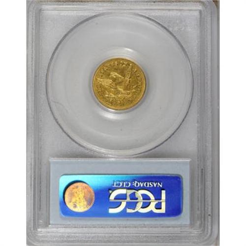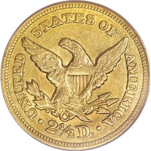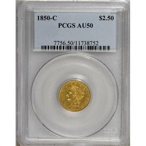 <B>1850-C $2 1/2 AU50 PCGS.</B></I> Variety 12-G. Two different reverse dies were used for the coinage of 1850-C quarter eagles. The mintmark is centered over the digit 1 in the fraction on this variety with reverse G. The other reverse has the mintmark centered over the top of the fraction bar. Variety 12-G is slightly more common. Traces of luster reside in the recesses of this bright peach-gold specimen. Well defined, except for softness in the eagle's legs. A couple of hair-thin marks are noted on the obverse.<BR><BR><B>Coin Engraver:</B> Christian Gobrecht<BR><BR><b>Shipping:</b> Coins & Currency (<a target="_blank" href="http://www.heritageauctions.com/common/shipping.php">view shipping information</a>)
