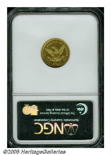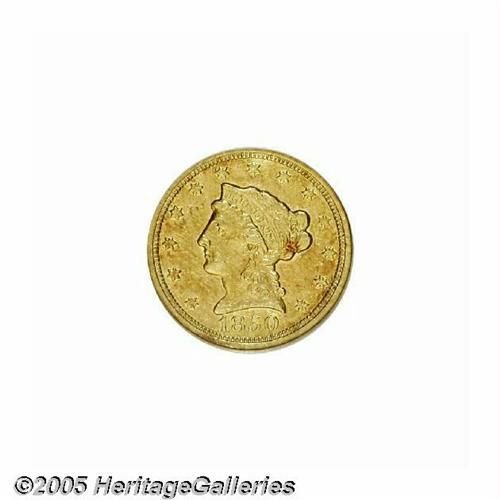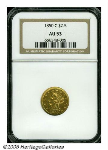 <B>1850-C<$2 1/2> AU53 NGC.</B></I> Variety 12-G. While one of the more available C-mint quarter eagles, the 1850-C is a conditionally challenging issue with only 15-18 pieces believed extant today in all grades of AU. This piece, unlike most known '50-C quarter eagles, lacks heavy abrasions. It shows numerous light marks, and the devices are softly struck as always seen on this issue. Both obverse and reverse show a significant overlay of reddish patina that gives prospective buyers assurance of originality--something that is not a given on C and D-mint gold.